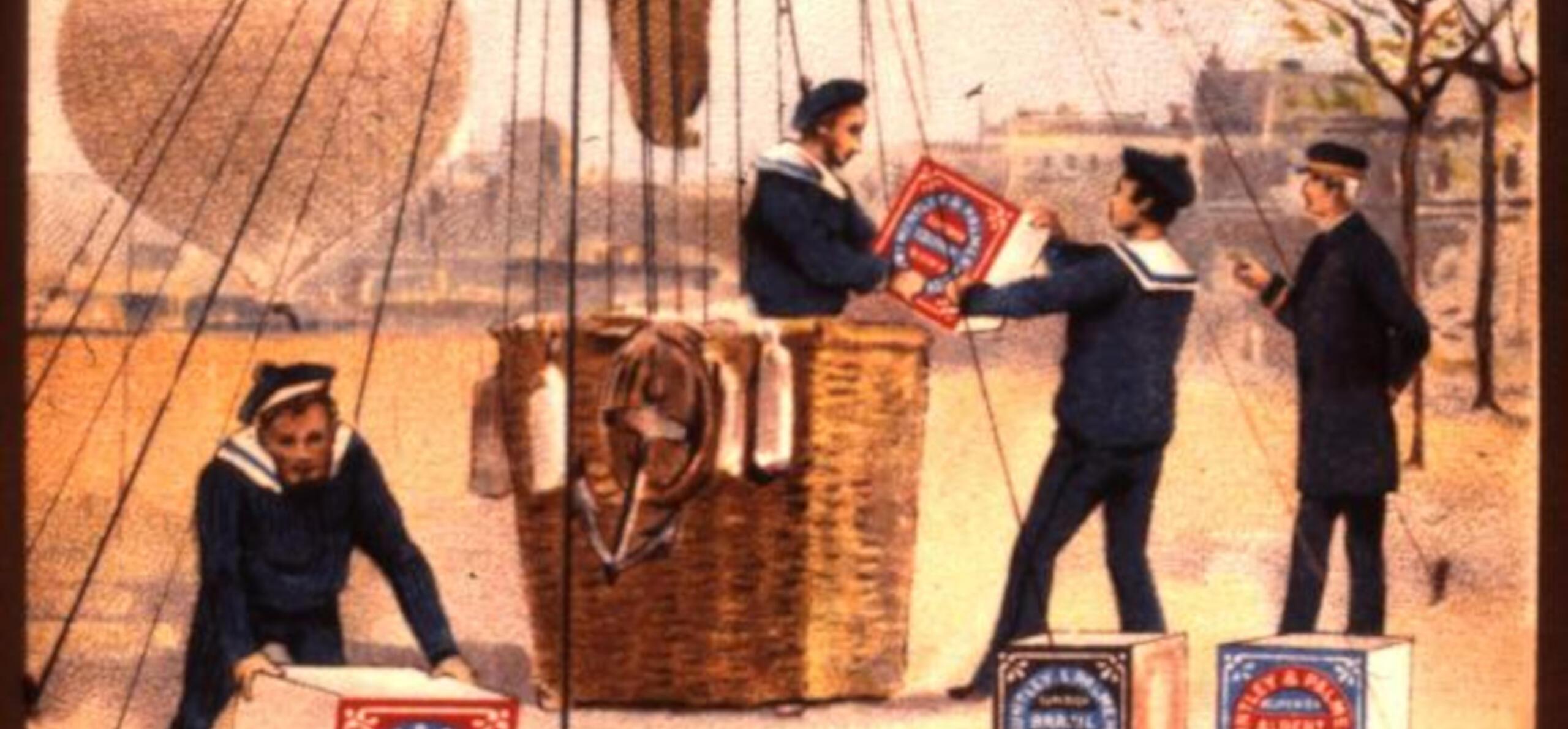 Huntley & Palmers produced hundreds of trade cards, which depicted how their biscuits reached the four corners of the globe. The cards were given to retailers and on the back of each card was a description of their latest products. These cards show Huntley & Palmers biscuits being transported using camels, elephants and via a hot air balloon.