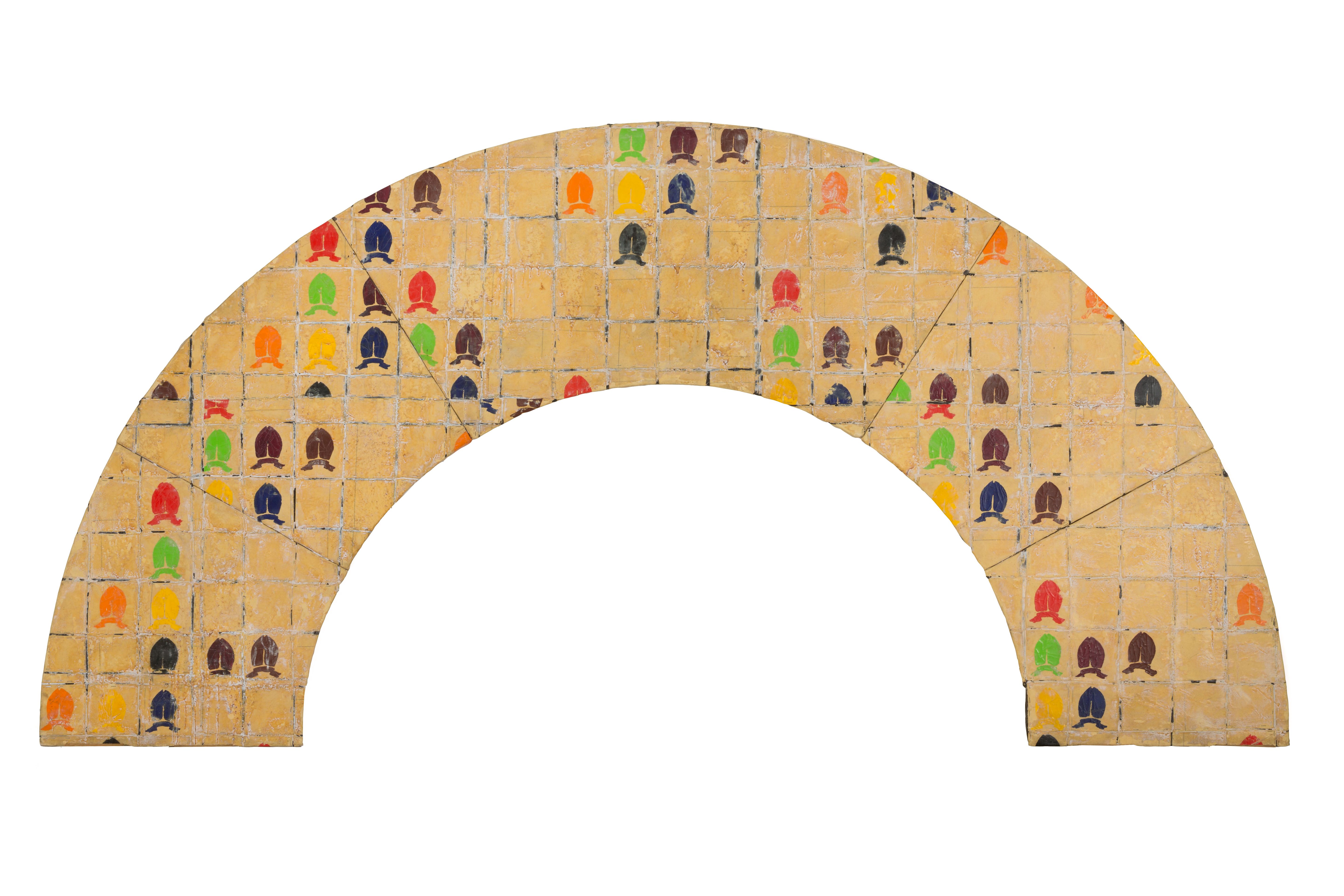 A useful starting point is thinking about how the piece could have been made and then going on to think about why the artist might have chosen to make it in this way and finally to think about what it could mean for you, what it makes you think about. For example, in the gallery there's the Steven Buckley arch, Tarantara. You might think: oh, that looks like a pattern on a wooden arch. But if you look more closely, you'll spot that it's in five pieces. It doesn't have a frame. It's stood on the floor. It's not just an image, it’s a painted thing, even a sculpture. And if you look closer still, you'll see that it's not painted on a flat service, but on strips of canvas, stapled together. It's a patchwork collage, created by combining bits of old paintings that have been repainted. Buckley has used something called encaustic, an ancient painting technique used in Roman coffin portraits, a complex way of suspending pigment in wax. You’re led to wonder: why did the artist choose to do this? There's a bit of white blooming on the surface which will change over time so did he deliberately include its gradual disintegration in his work?