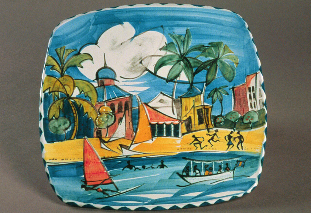 In 1998, as the pottery was being cleared, Alan gave the Museum a further ten works selected to suggest the range of his work beyond lustreware. These included some of his favourite pots and some autobiographical works like a plate celebrating the colour and life on a Barbados beach which had delighted him when he arrived after three weeks of sailing across the Atlantic.