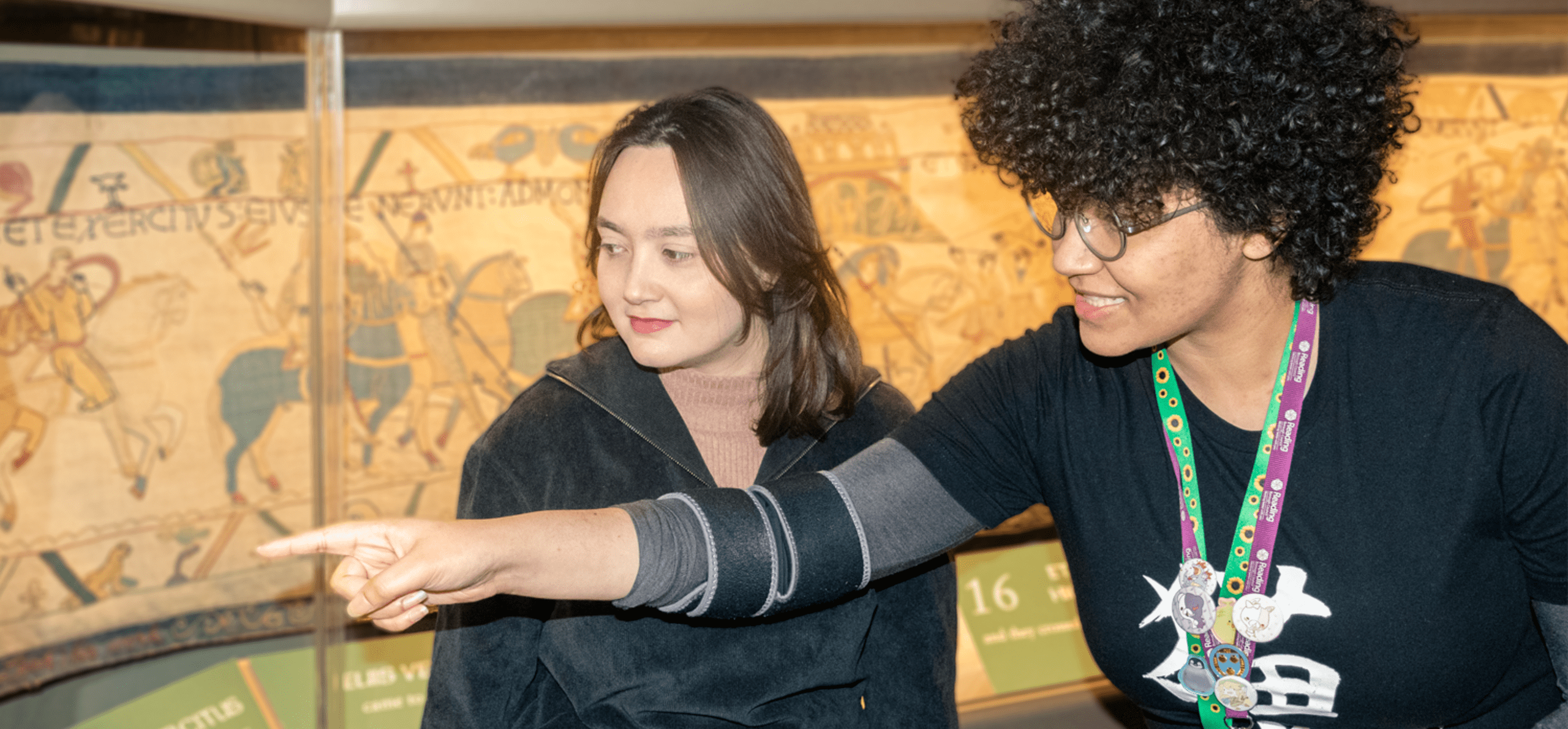 Our audio-descriptive tour of the Bayeux Tapestry for visually impaired adults are supported by using paddles with 3D relief drawings of scenes of the tapestry. These add a tactile experience of the artefact to its verbal description by the audio guide.