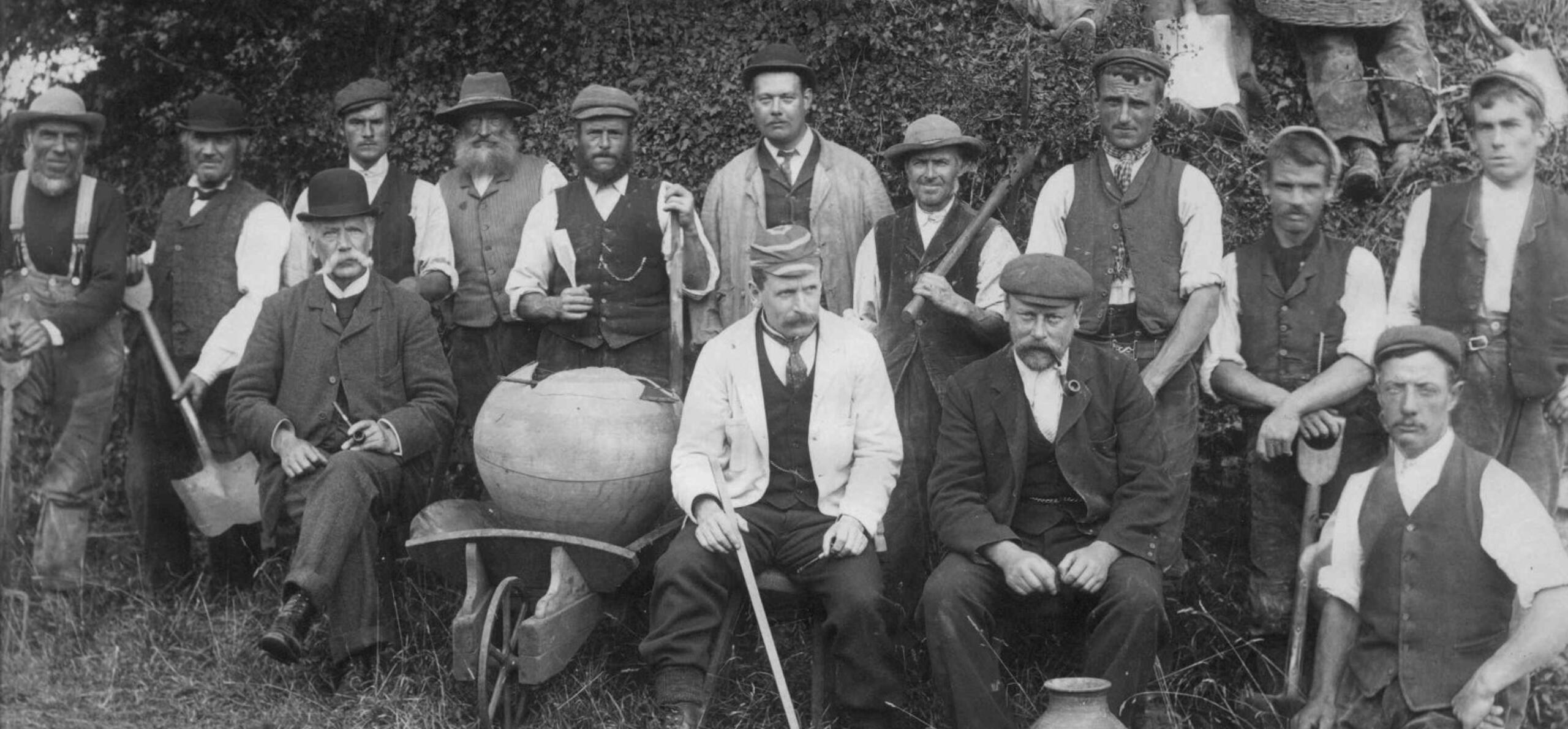 A photograph of the Jubilee Pot (REDMG : 1995.1.88) in a wheelbarrow with a group of excavators (REDMG : 2002.34.109).