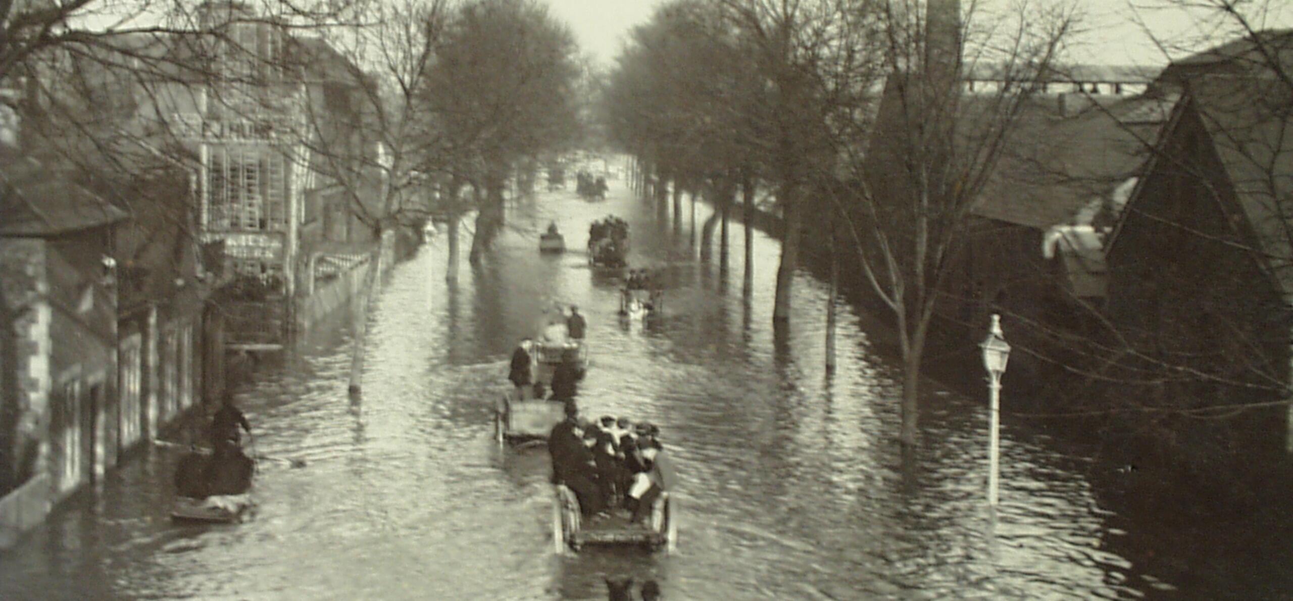 While flooding has been a regular occurrence throughout Reading's history, once or twice a century, the town has experienced floods of catastrophic proportions. Extreme events like these are well-documented both in Reading Museum's collections and in our town's cultural memory. For example, flood marks at Mapledurham Lock record the high water levels of 1894, 1947 and 2003. You can also see an 1894 flood marker on the bank of the River Kennet from the window of the Turbine House at the Riverside Museum at Blake’s Lock.