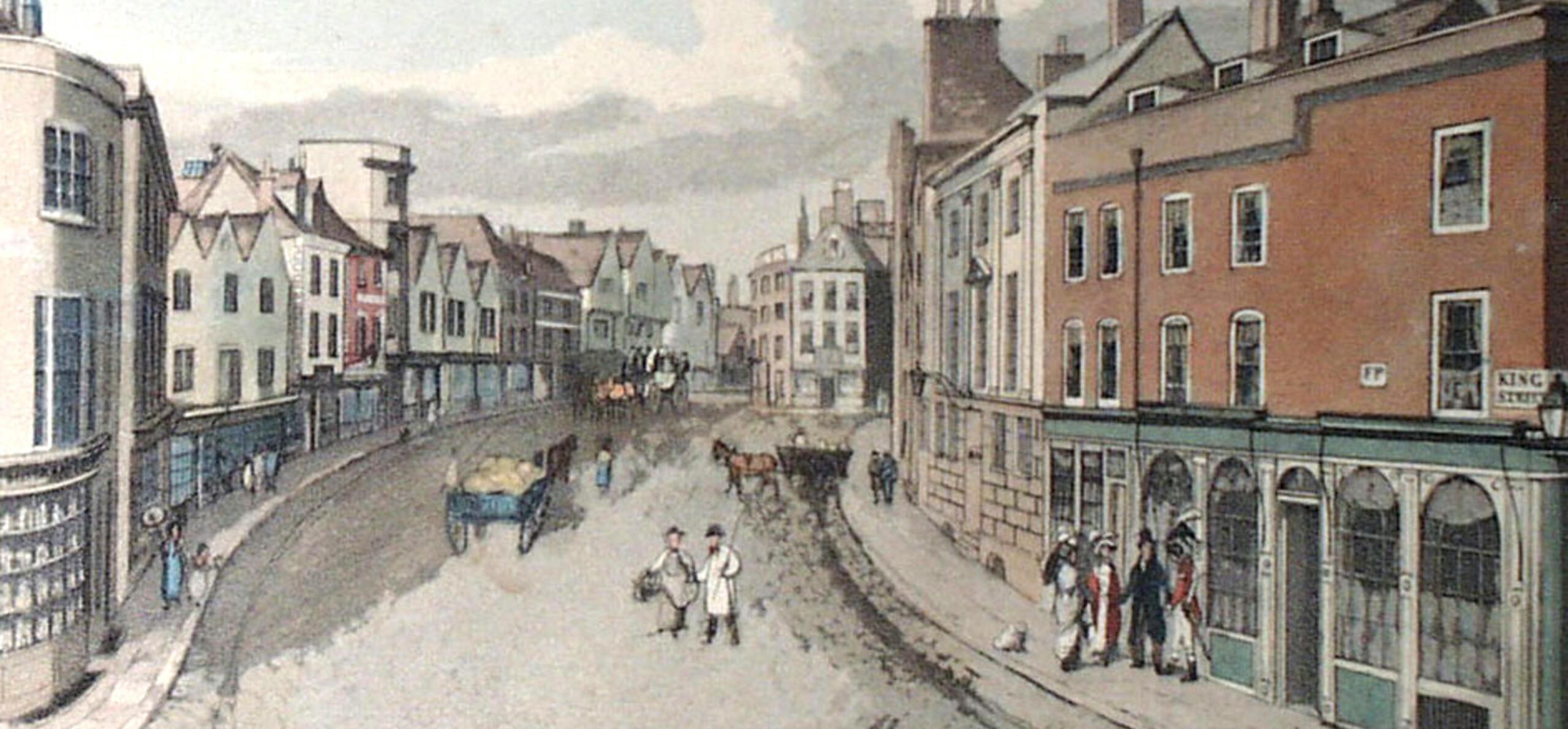 This has always been the heart of Reading’s shopping district. Until the 1860s it was densely packed with rows of half-timbered houses. Street names like Butter Market, Pig Market, Fisher Row and Butcher Row are clues to what medieval shoppers could buy.