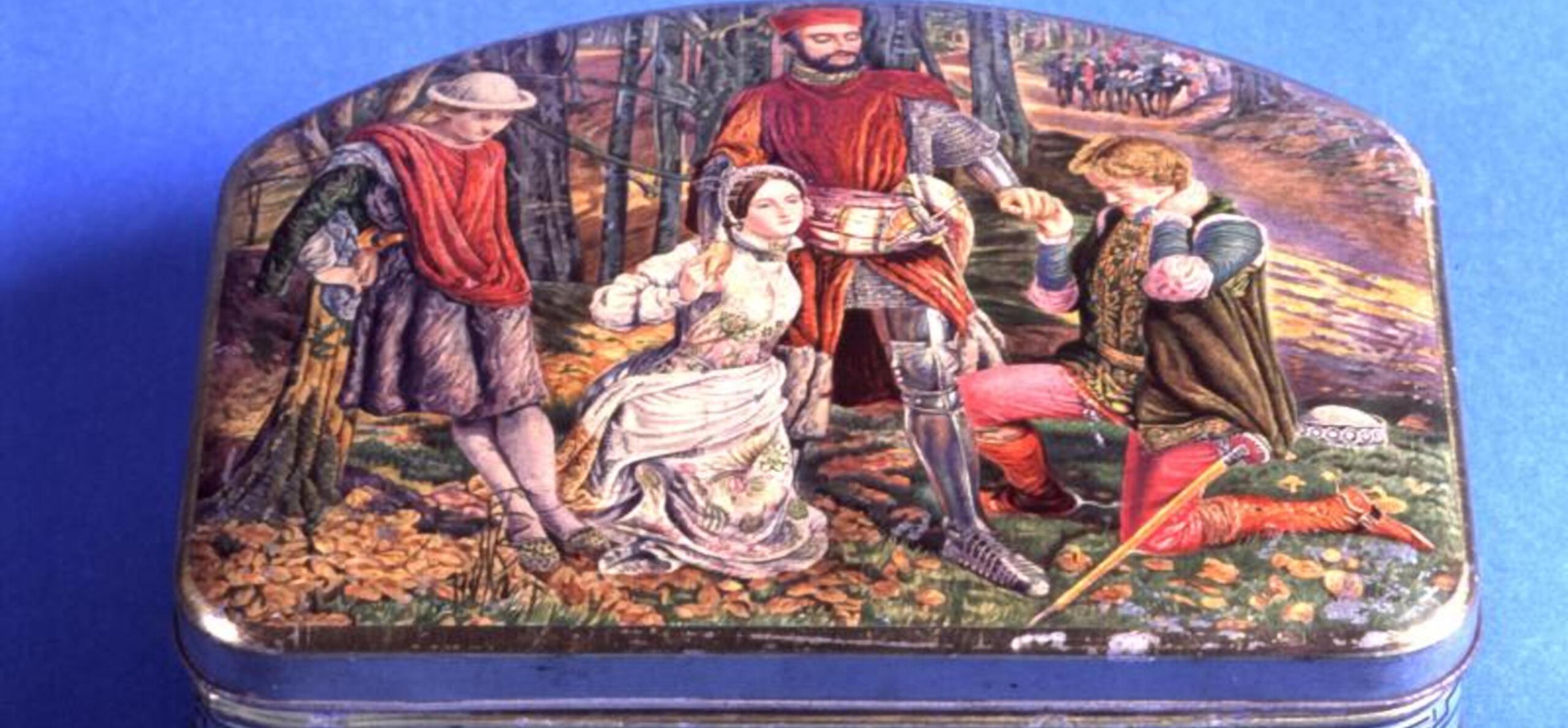 A tin which features William Holman Hunt's painting 'Valentine rescuing Sylvia from Proteus', a scene from Shakespeare's play Two Gentlemen of Verona. It was made by Huntley Boorne & Stevens of Reading using offset litho. (REDMG : 1992.2.260)