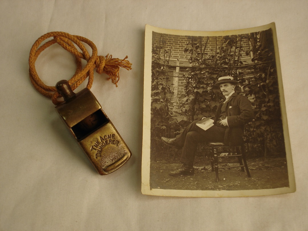 Portrait of Fredrick William Ackrill and his school whistle donated to the Reading Museum collection (REDMG:2019.17.1&2)