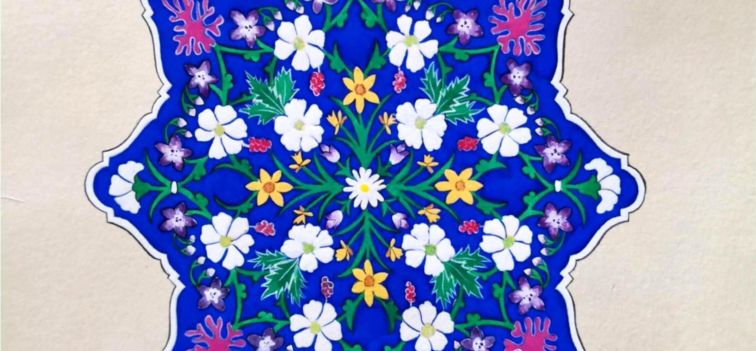 Hadil will lead you through a day exploring the processes and techniques involved. Using architectural and floral motifs found in and near the museum, she will help you to abstract them and think about how to organise them into intricate flowing designs. You will be introduced to the mirroring, repetition and geometry that lies at the heart of this way of painting as well as how to transfer drawings for filling with colour.