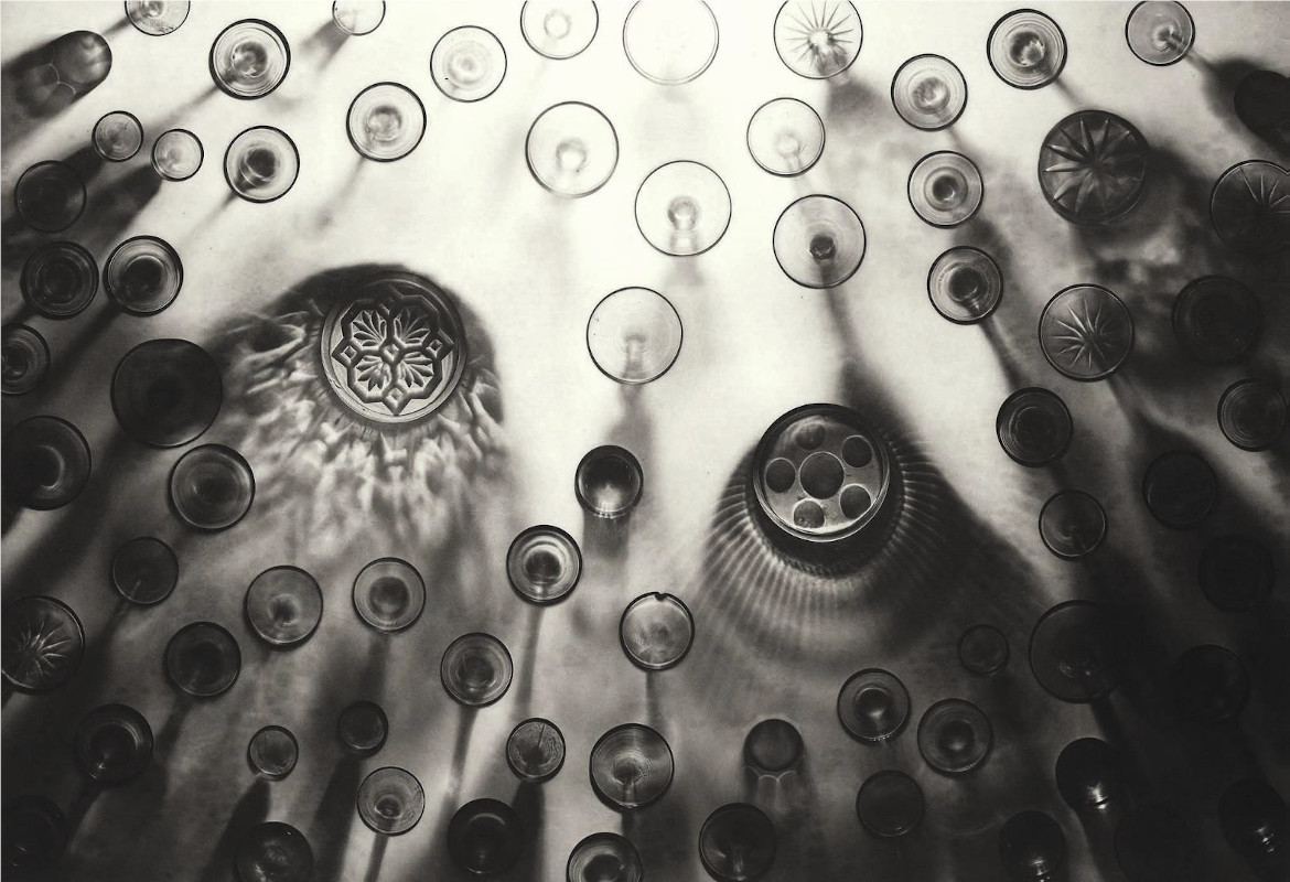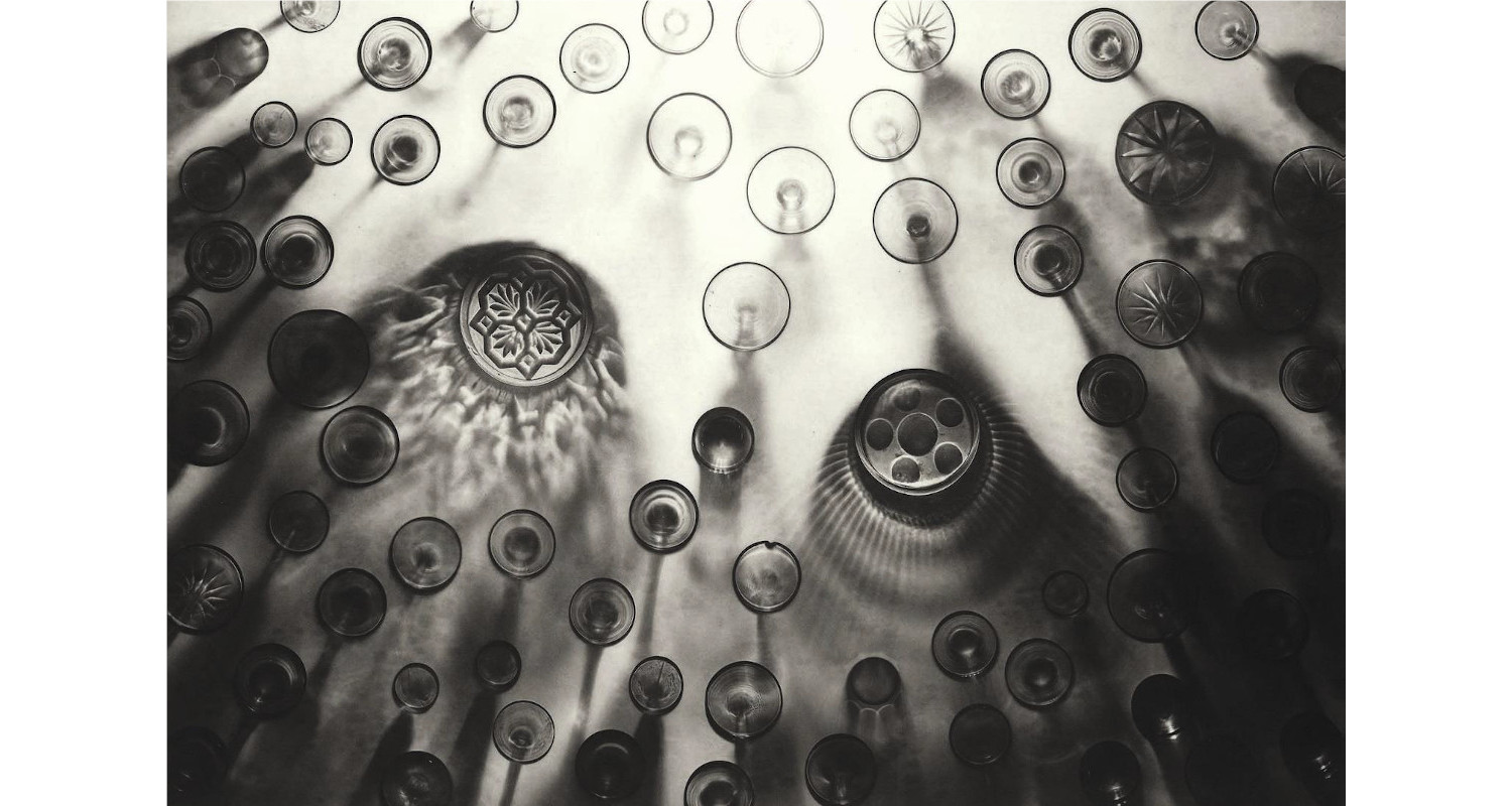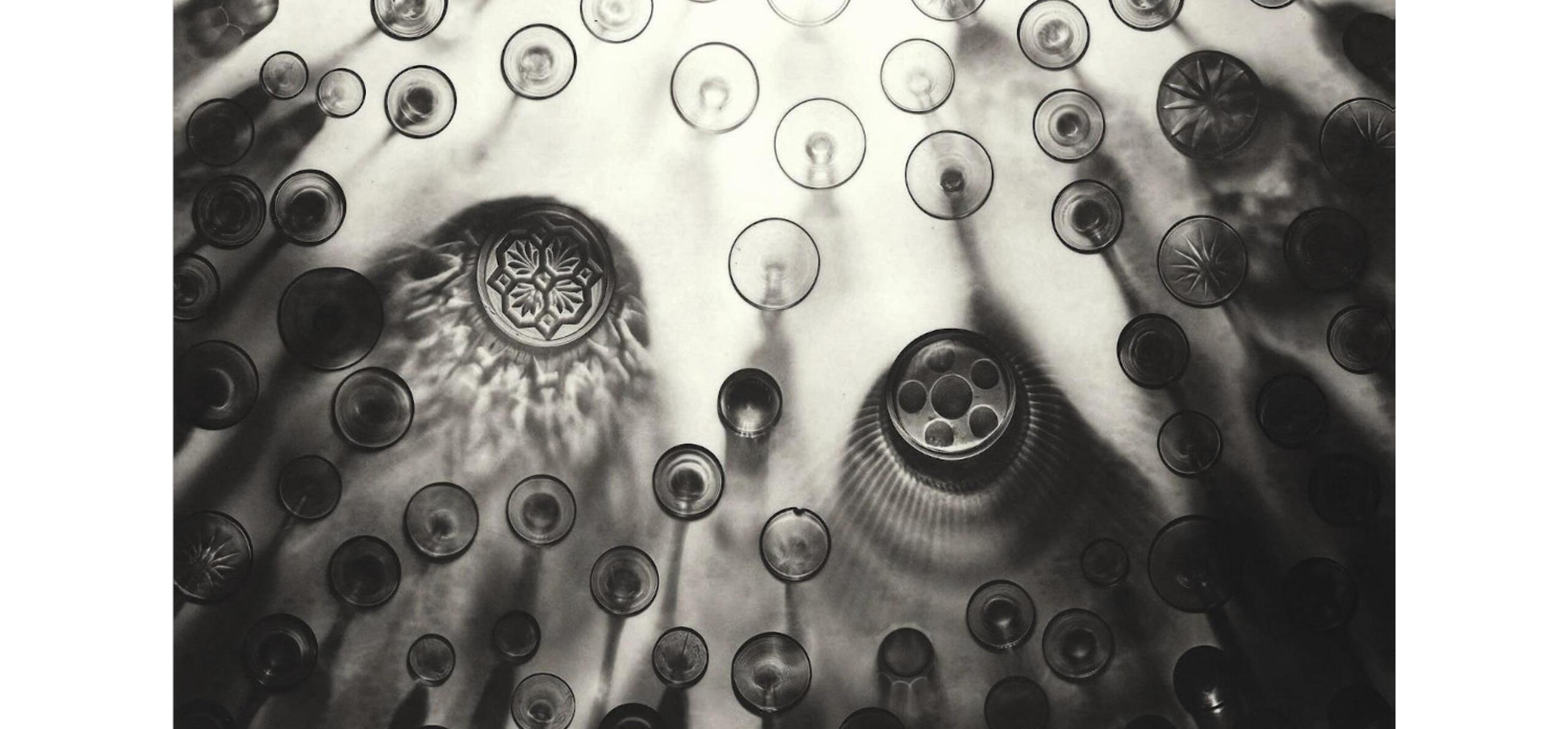 The patterns and shading were created by shining ultraviolet light through them onto the plate, which was then processed to make an etching. Where a glass was in contact with the plate it left a sharply defined black outline. Where its shadow fell the impression is softer but equally dark.