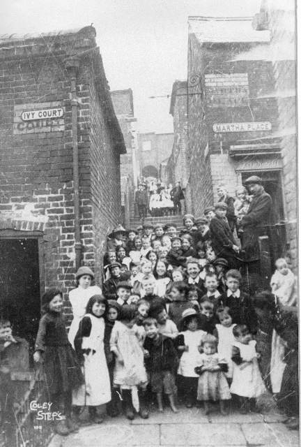 Coley Steps, about 1911. During the nineteenth century slum housing at Coley Steps was the most impoverished area of Reading. The Steps ran down the slope towards the River Kennet between Coley Place and Wolseley Street (REDMG : 1999.1.1)