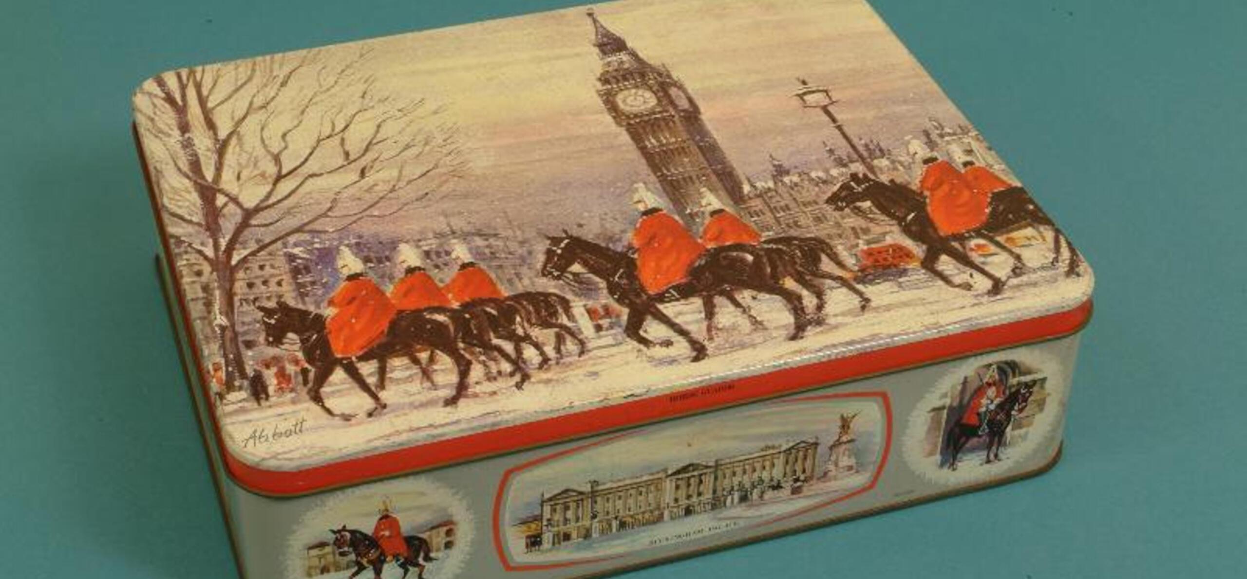 This tin is in the shape of a sentry box with illustrations around the sides of Guardsman, Royal Marine, Yeoman and Hussar. The slit in its red plastic lid meant it could be reused as a money box. (REDMG : 1992.2.352)