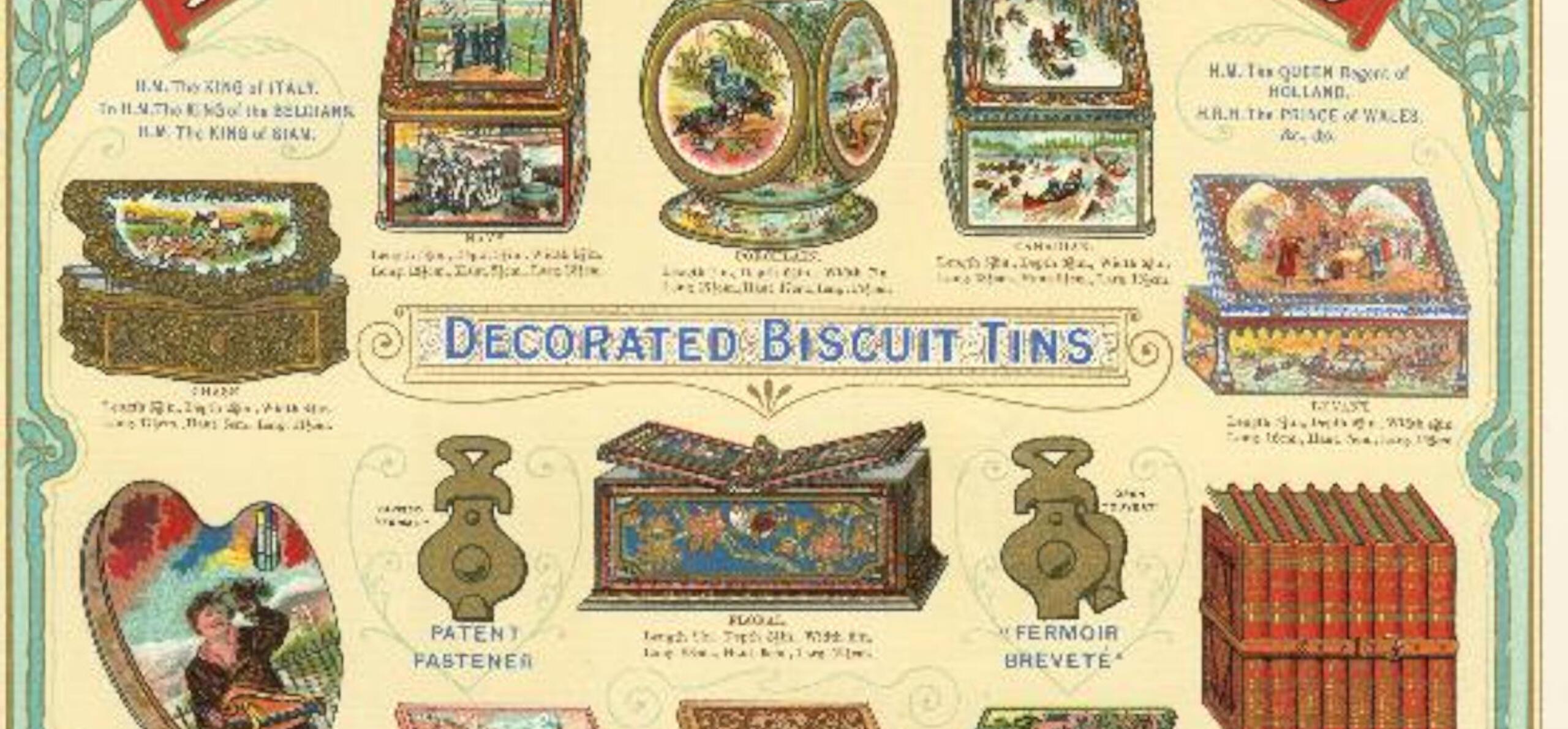 Although the majority of Huntley & Palmers' tins were made by Huntley, Boorne & Stevens, they did use other tin manufacturers as the East and West tin illustrates. Any firm could buy an exclusive right to a tin design. Alternatively, for a smaller amount, they could secure the rights to a particular design for a year or two after which the design would become available to other manufacturers.