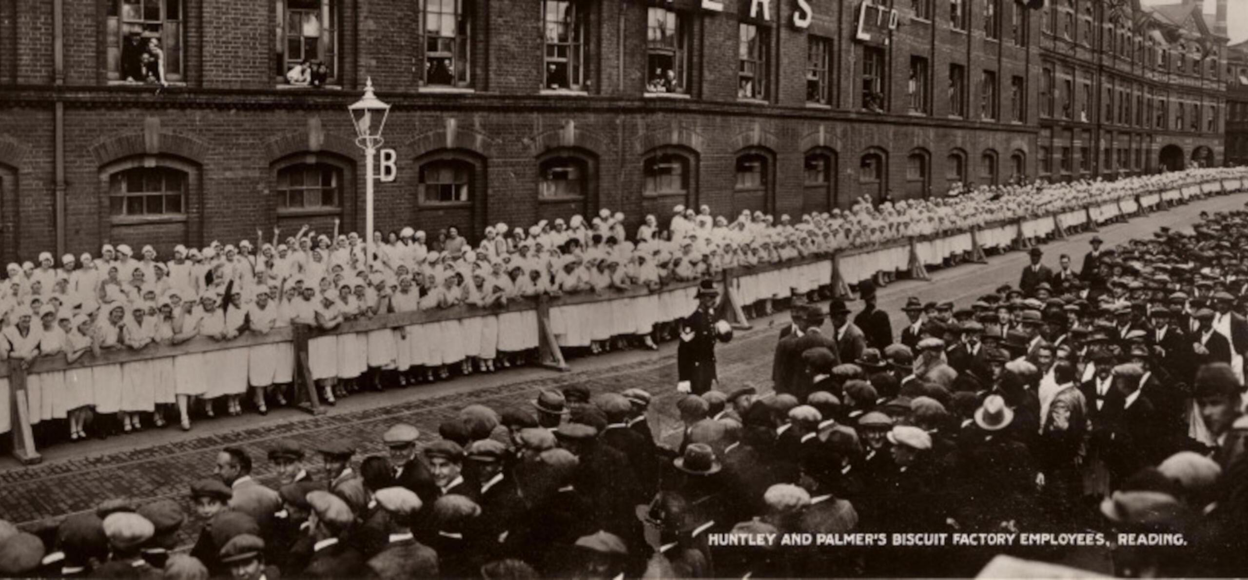Huntley & Palmers staff line the street to welcome the Prince of Wales' visit in 1926. The segregation of male and female employees is very clear, with women wearing white and men in darker clothes. (REDMG : 1997.120.268.4)