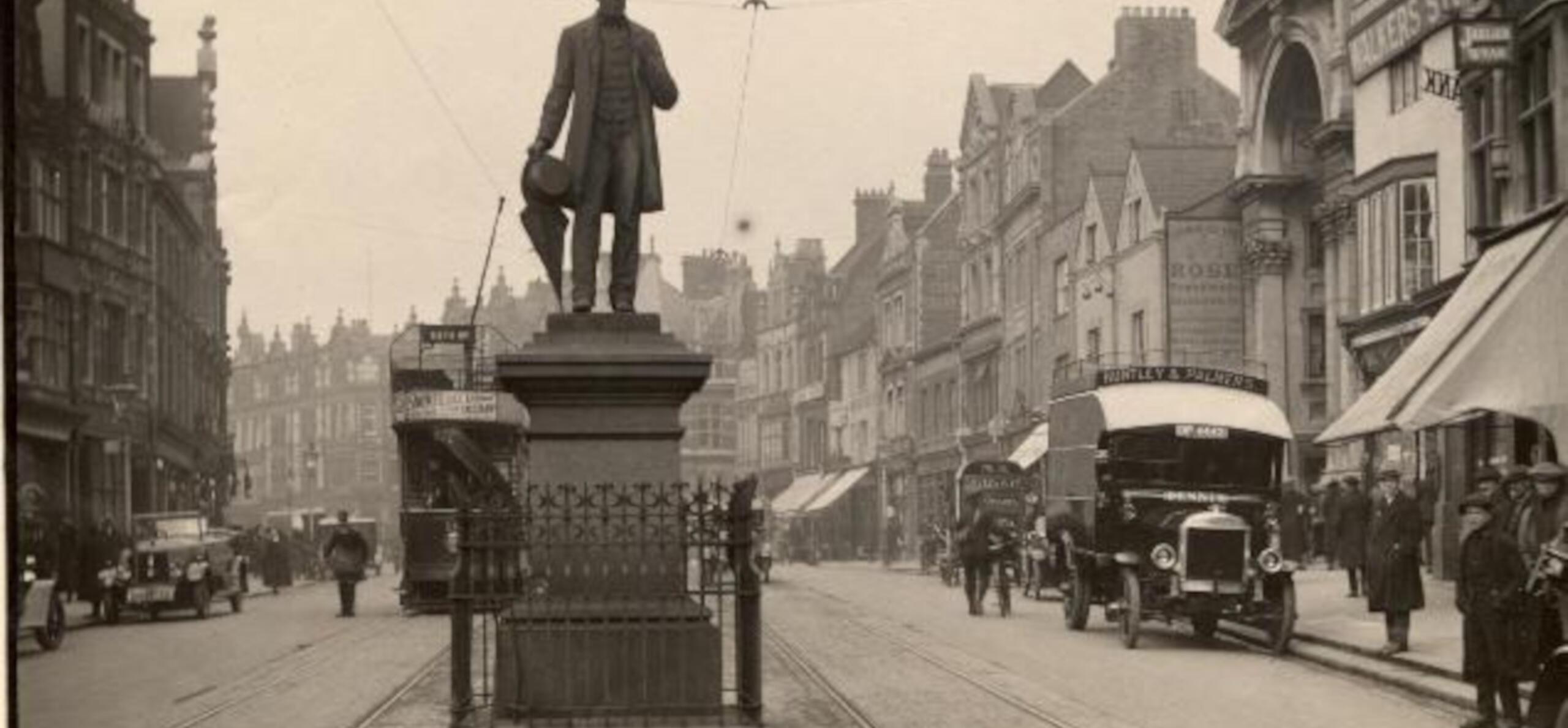Funded by 4000 subscriptions from local people, George Palmer's statue stood at the eastern end of Broad Street until 1930. Pictured here in the 1920s, you can even see a Huntley & Palmers delivery van in the background. (REDMG : 1997.130.206)