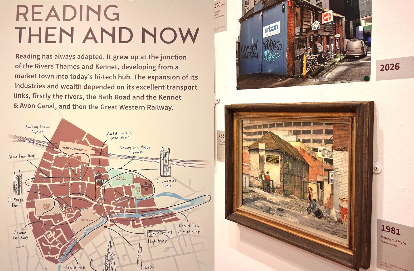 This exhibition shows historic views of Reading with the same view today in the town centre, such as Merchant's Place in 1981 and 2026